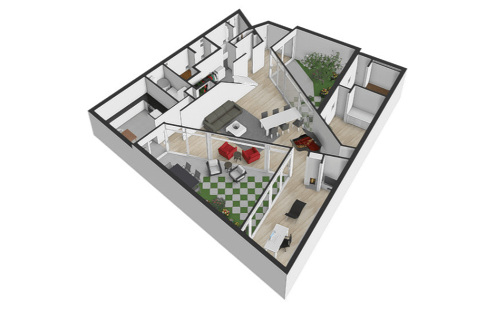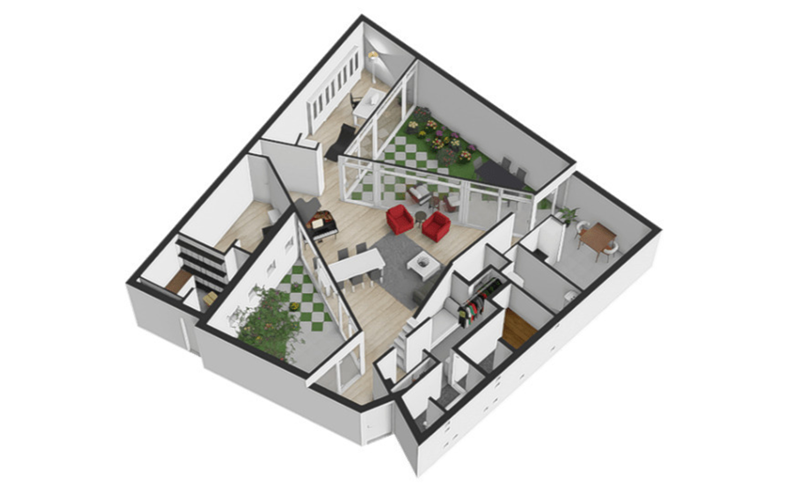 Immediately after entering, the surprisingly generous and flexible central living space unfolds with an impressive ceiling height and two carefully designed and planted patios. The attention to detail creates a peaceful living environment with a zen-like quality in which light and colour play create a poetic atmosphere. Thanks to the two intimate patios, daylight pours in and, because the upper parts of the facades are made of frosted glass, there is a maximum of light with utmost privacy. The glass doors in the three corners can be opened, intertwining indoors and outdoors.