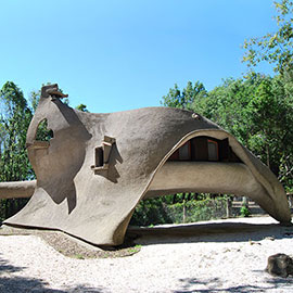 The popular name for the house is Casa Dinosauro. It was built by Vittorio Giorgini (1926-2010) from a double metal net covered with sprayed cement and left coarse, in some places shaped by hand, to form a slab here and there of pierced openings similar to that of paper cuttings.