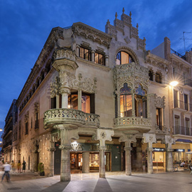 Casa Navàs is a magnificent modernist building designed by Lluís Domènech i Montaner (1850-1923) and built between 1901 and 1911 in the center of Reus, on Plaça del Mercadal. The house originally combined a commercial shop with a luxurious residence for textile merchants. Its interior, complete with original furniture, richly decorated ceramics, mosaics and more than 200 square meters of stained-glass windows, remains intact. Casa Navàs offers a unique and authentic glimpse into early twentieth-century Catalan modernism.