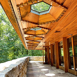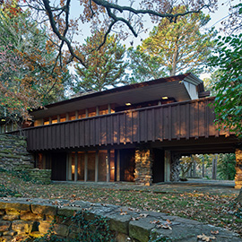 Built on a hexagonal module, Kentuck Knob is a small, one-storey Usonian house, meaning affordable for the average American: a signature design of Wright. Both dramatic and serene, the house stands 625 metres above sea level and almost appears to be part of the mountain it sits on. Completed in 1956, opened for tours in 1996.
