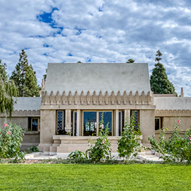 Wright's first home in LA is an exotic blend of pre-Columbian, Japanese and Californian influences. Commissioned by heiress Aline Barnsdall, it pays homage to her favourite flower, the hollyhock, with abstract designs of the plant in its frieze and other details. It is a UNESCO World Heritage Site and a National Historic Landmark.